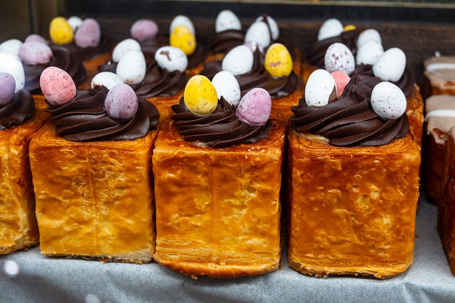 K  Velikonocům v Anglii  také neodmyslitelně patří čokoládové dobroty. V čokoládovnách a cukrárnách můžete zakoupit  luxusní čokoládová vajíčka , často i ručně zdobená, různých velikostí a stylů, a dovézt si tak domů sladký velikonoční suvenýr.