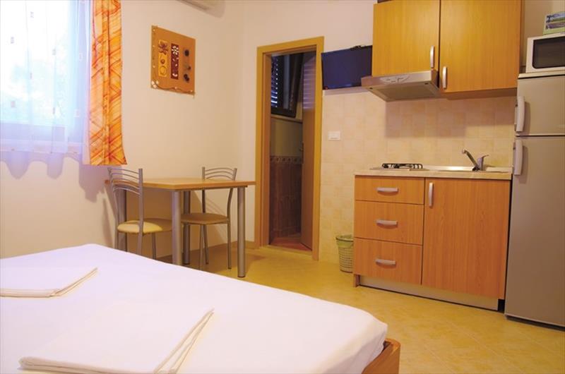 studio pro dvě osoby bez balkónu nebo apartmány pro 2-6 osob s balkónem, které jsou vybaveny manželskou postelí, kuchyňským koutem, lednicí, mikrovlnou troubou, koupelnou SWC, klimatiazcí a Wi-Fi zdarma.