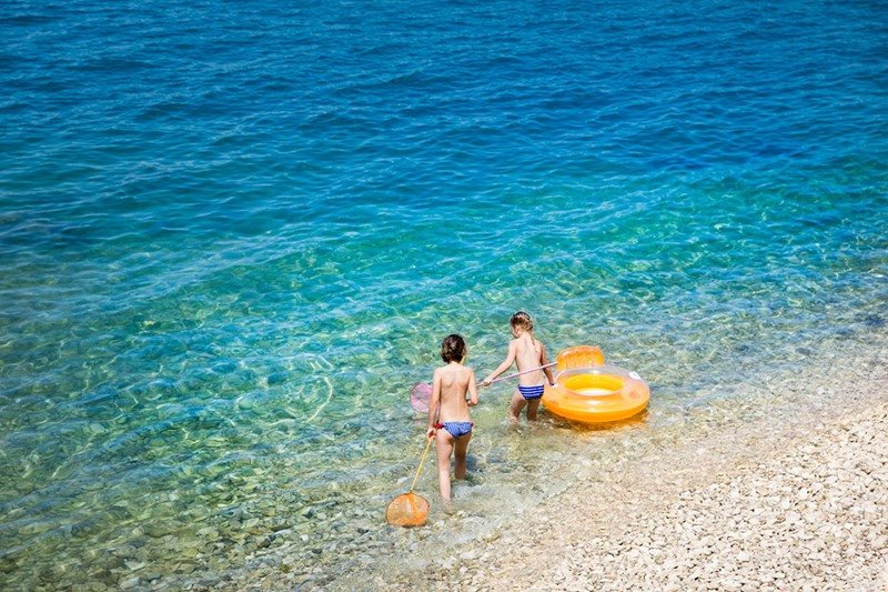 Pláže jsou skalnaté, přírodní kamenité, betonové a oblázkové vzdálené 20-300 m, malá část pláže je vyhrazena pro psy. Lehátka a slunečníky na pláži jsou za poplatek. Na pláži jsou také sprchy a převlékací kabinky. Přilehlá pláž Crnika je oceněna Modrou vlajkou.
