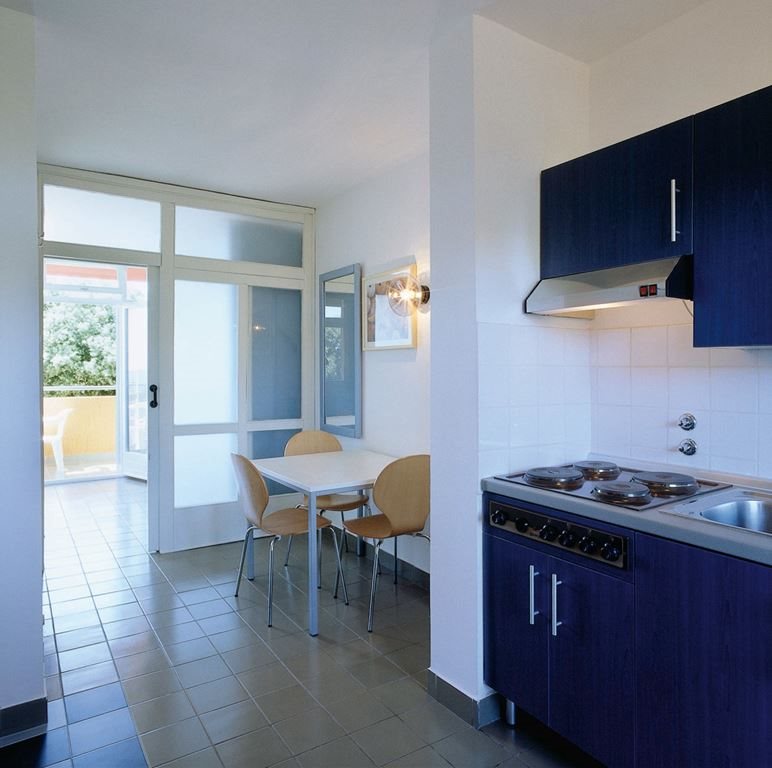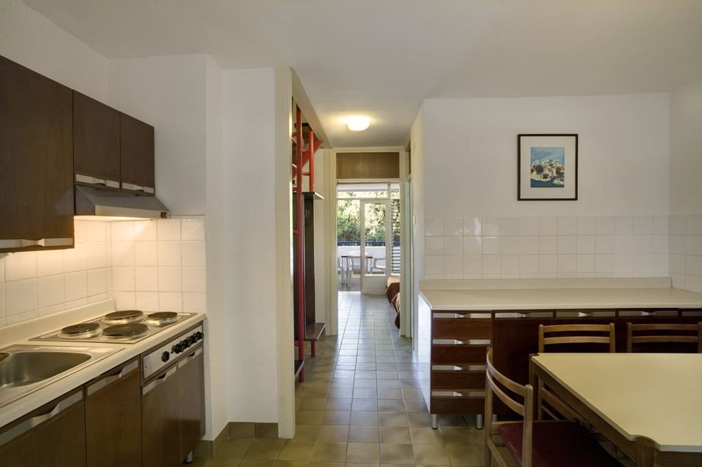 1/4 APT (44 m2) má dvoulůžkovou ložnici, denní místnost s kuchyňským koutem a s rozkládacím gaučem pro 2 osoby (190 x 180 cm), koupelnu, balkon.