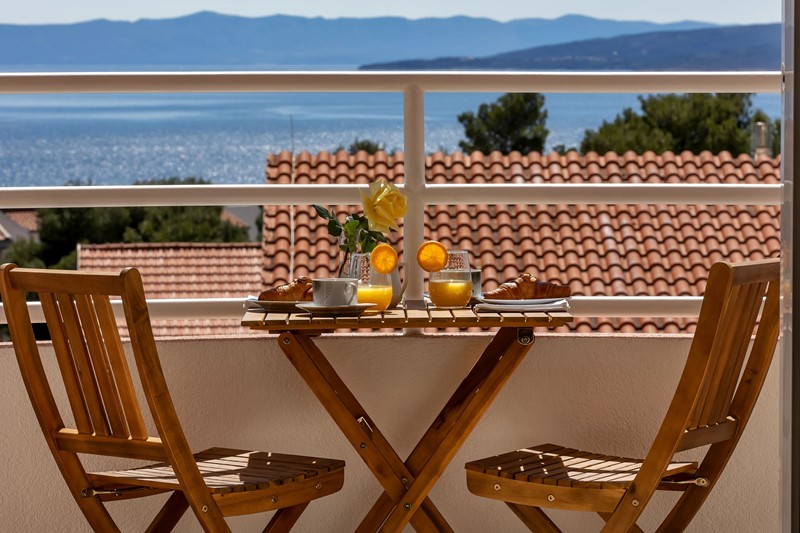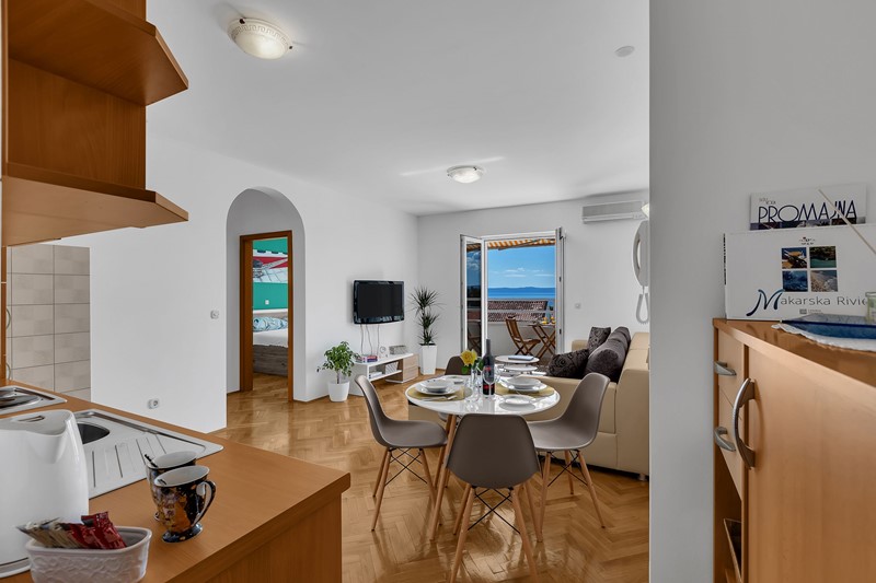 Apartmán Emili se nachází jen 400 m od moře, v klidném prostředí v Promajně. Je vhodný pro rodiny s dětmi, pro max. 4 osoby. Je moderně vybavený a klimatizovaný (2 klimatizační jednotky). Skládá se z ložnice s manželskou postelí, denní místnosti s rozkládací pohovkou a vybaveným kuchyňským koutem a koupelny s vanou. Hostům je k dispozici pračka, satelitní TV, WI-FI, parkování zdarma. Apartmán má balkon s výhledem na moře.