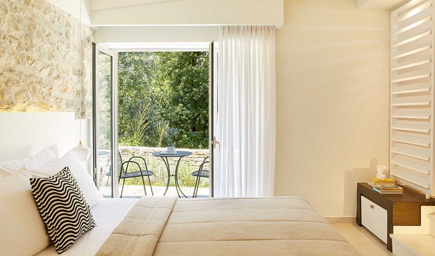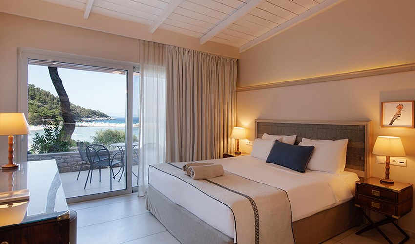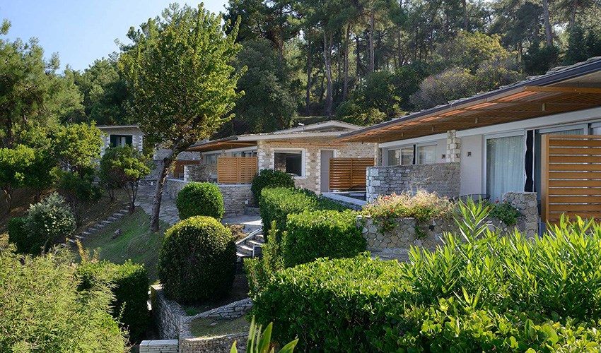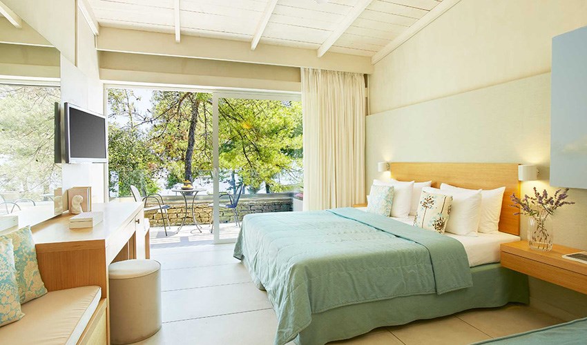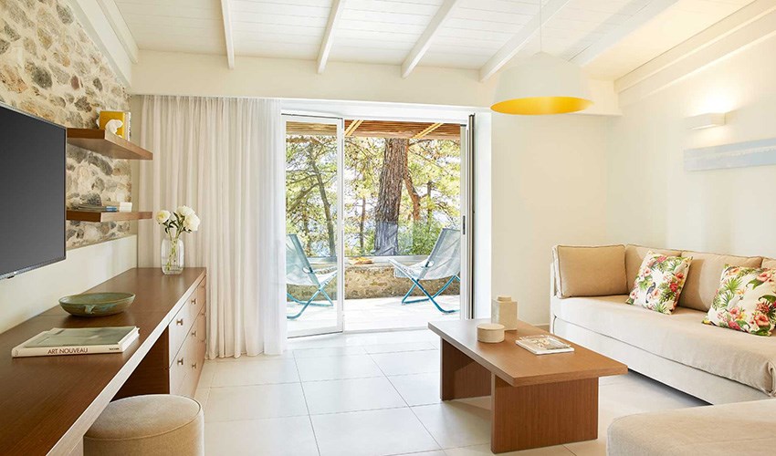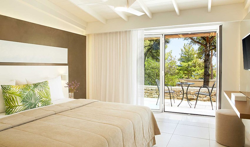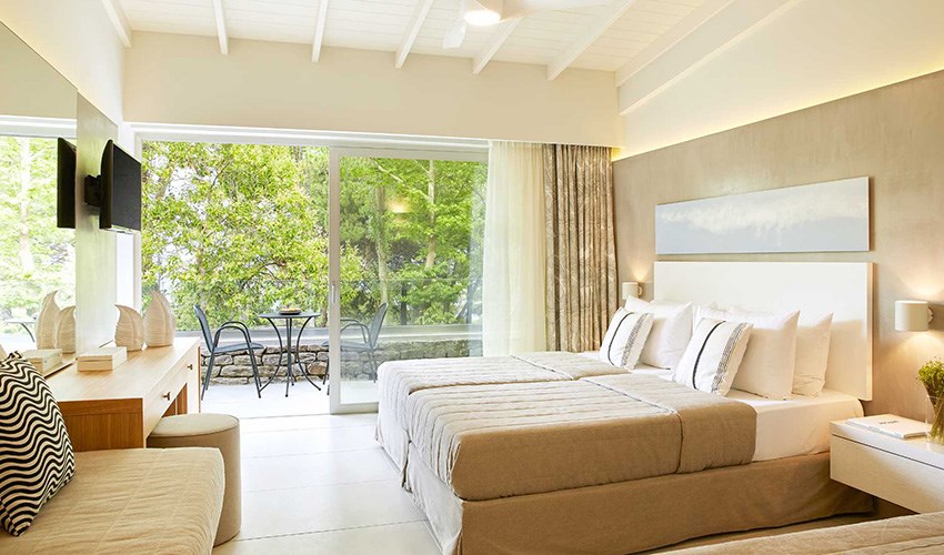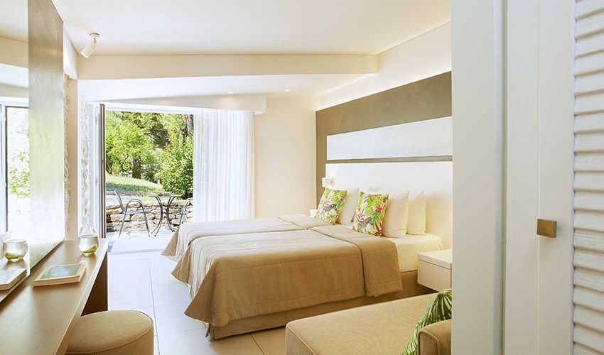 pokoje JUNIOR SUITE SUPERIOR: dvoulůžkové pokoje s možností až dvou přistýlek umístěny v bungalovech v areálu do 350 m nad pláží, terasa s částečným výhledem na moře.