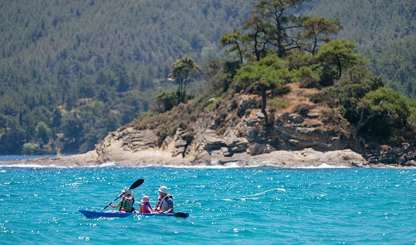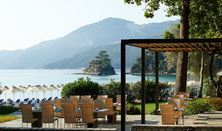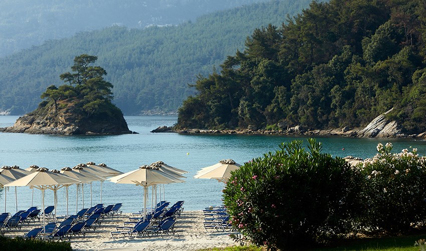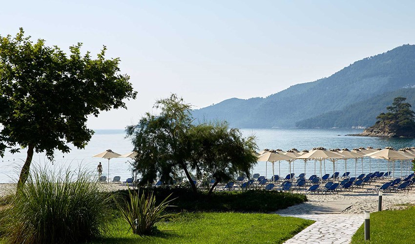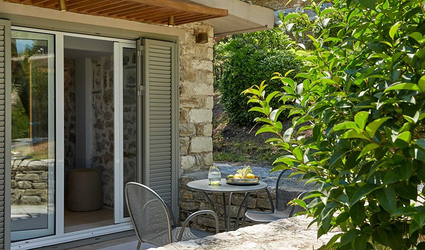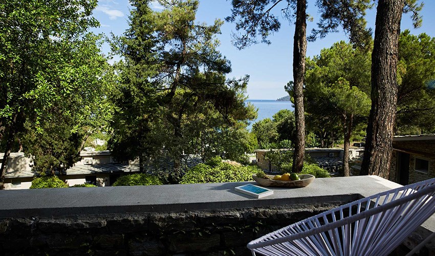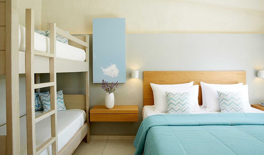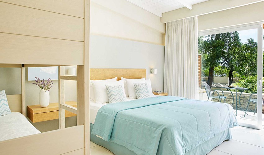 pokoje FAMILY SUITE SUPERIOR: rodinné pokoje až pro 5 osoby (2 částečně oddělené místnosti) umístěny v bungalovech v areálu do 350 m nad pláží, terasa s výhledem na moře.