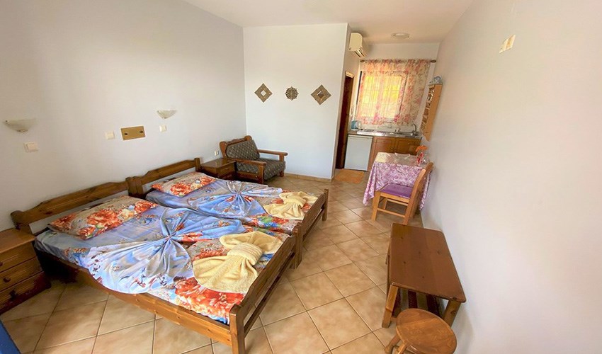 dvoulůžková studia koupelna s toaletou, fén kuchyňský kout (vařič, lednice, základní nádobí) klimatizace (za poplatek cca 10 €/ den) Wi-Fi balkon nebo terasa