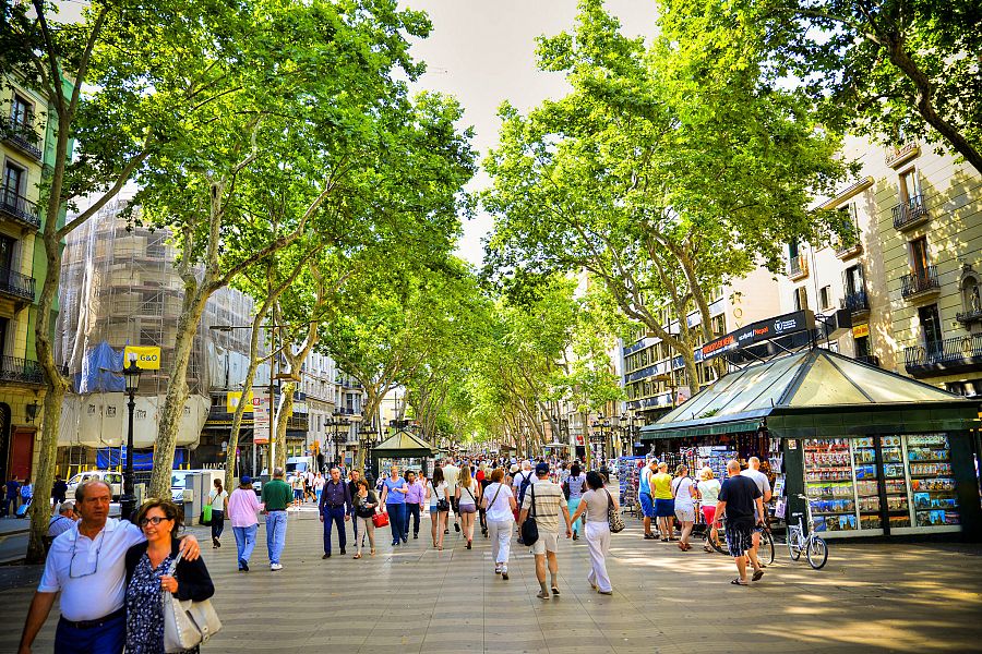 Vlnky na dlažebních kostkách nejznámější a nejrušnější ulice Las Ramblas nás povedou pod mohutnými korunami platanů dále k moři.