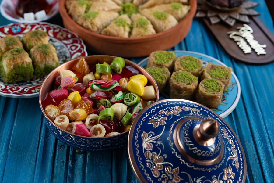 Kromě zmrzliny můžeme ochutnat například jeden z nejikoničtějších tureckých dezertů – baklavu . Baklava je vrstvené filo těsto plněné sekanými ořechy a zalité sladkým sirupem z medu a cukru. Nebo si můžeme dát lokum , což jsou malé želé kostky ochucené růžovou vodou, citronem, mátou, pomerančem nebo granátovým jablkem.